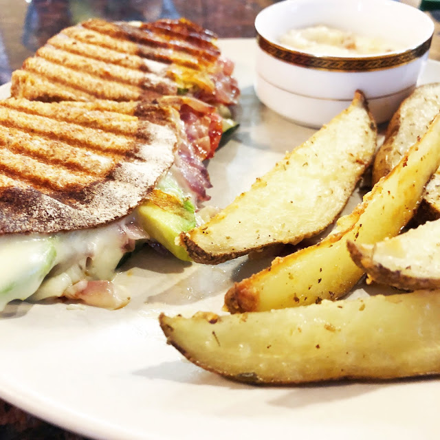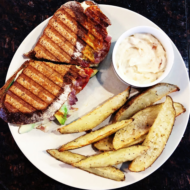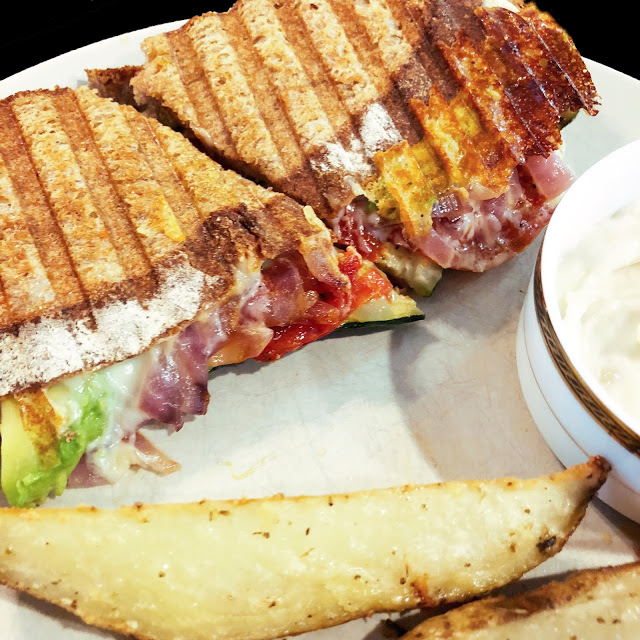 Preheat panini press plates to 400 degrees each. Place zucchini slices on panini press for 2-3 minutes until tender, and then remove from heat. In a medium skillet, sauté red onion for approximately 7 minutes, then remove from heat. Brush the outward facing sides of the whole wheat mountain bread with olive oil. Place spinach, grilled zucchini planks, roasted tomato slices, red onion, avocado, and American cheese on the sandwich. Follow with the other piece of mountain bread, oiled side facing outwards. Press in panini press for 4-6 minutes. Serve with parmesan fries (recipe below) and roasted garlic aioli (recipe below).