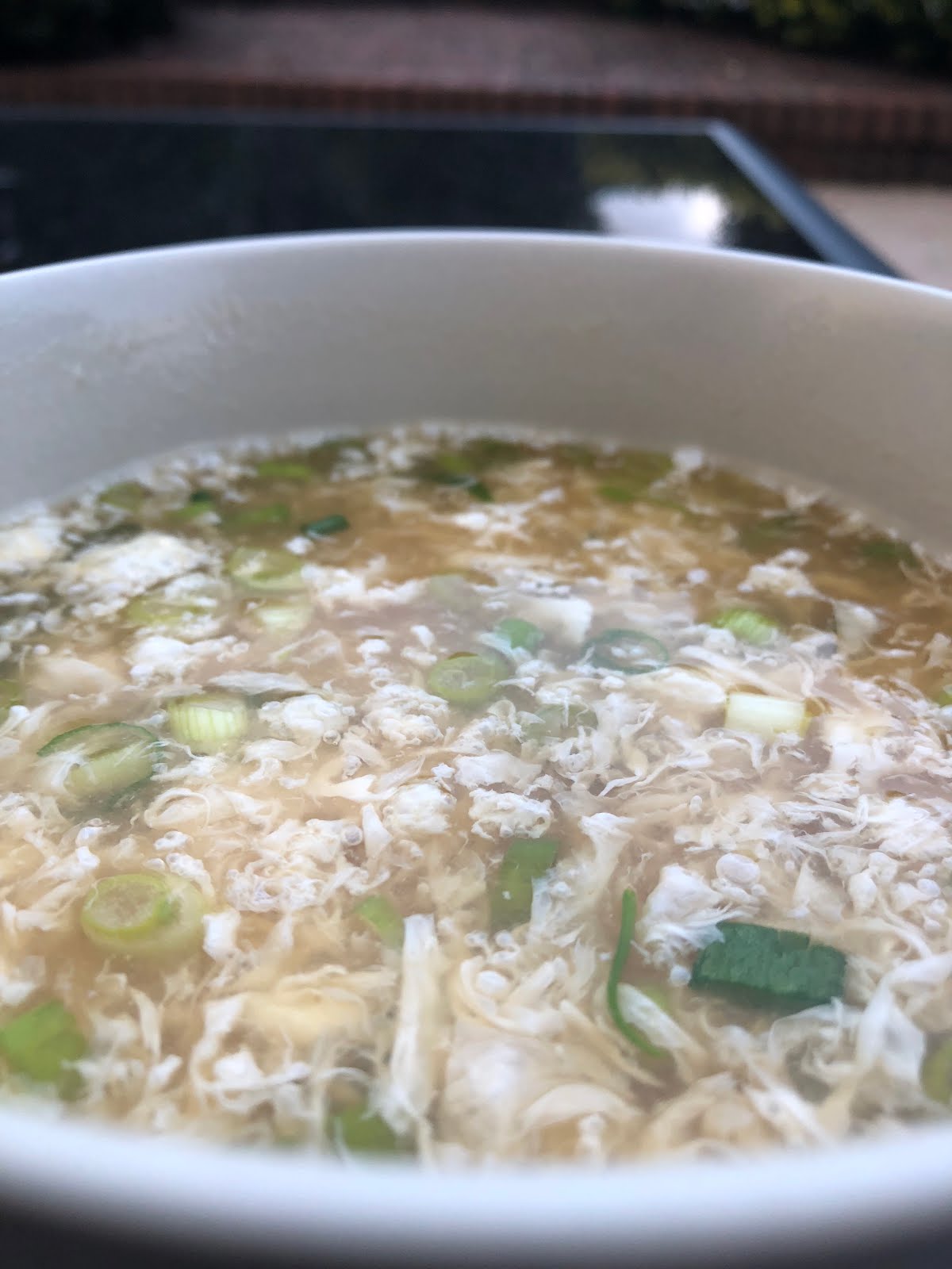 Heat vegetable broth, water, sesame oil, and soy sauce to a boil, and stir in vegetable soup base. Place ginger and garlic in tea ball and simmer for 45 minutes to an hour. Remove tea ball and discard ginger and garlic. Bring broth to a boil again; using the reserved vegetable broth mixed with cornstarch, pour in slowly while whisking till desired consistency is reached. Beat oil and egg whites well. Whisk boiling broth in circles, and quickly turn off heat. Slowly add egg whites to churning broth with fork to feather egg whites. Add green onions. Serve.