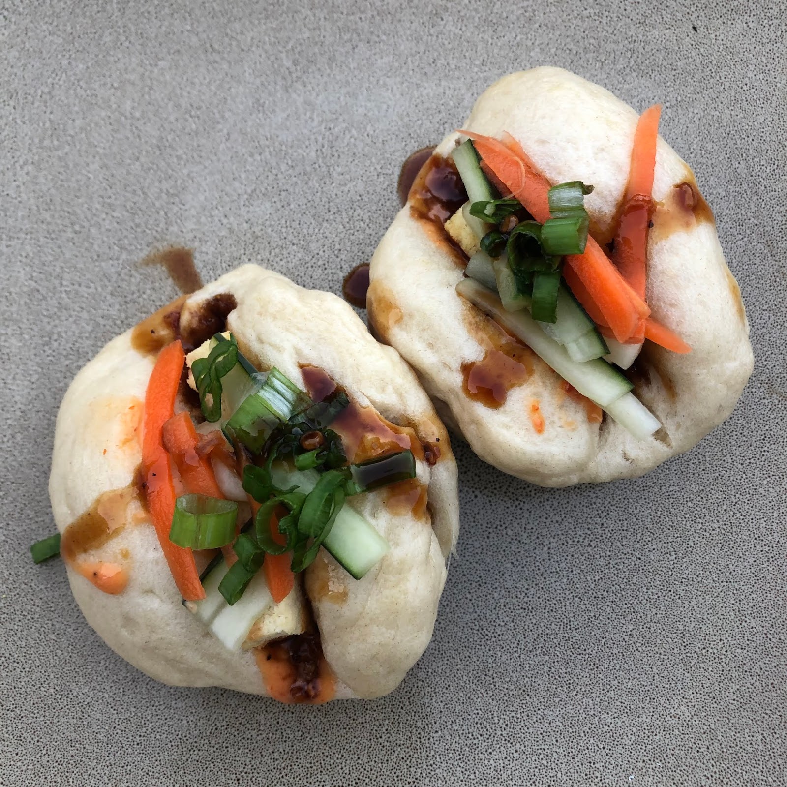 Place a spoonful of the glaze and spicy yum yum sauce in the fold of each bun, and place some pickled vegetables and tofu strips on top. Add scallions, and top with more sauce if desired.