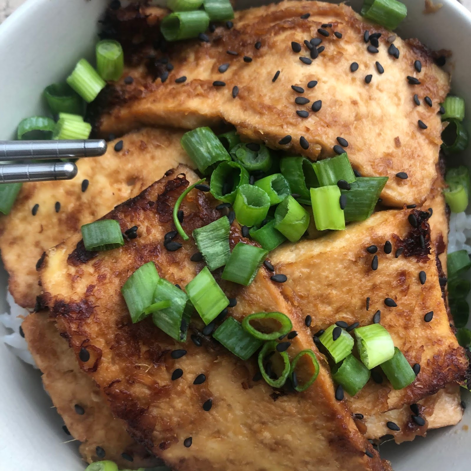 Make the sauce by mixing the ginger garlic paste, soy sauce, sesame oil, doenjang paste, and brown sugar. Pour sauce over tofu slices in baking pan. Bake for 20 minutes, then flip tofu over, and bake for another 15 minutes. Serve over white rice with green onion as garnish.