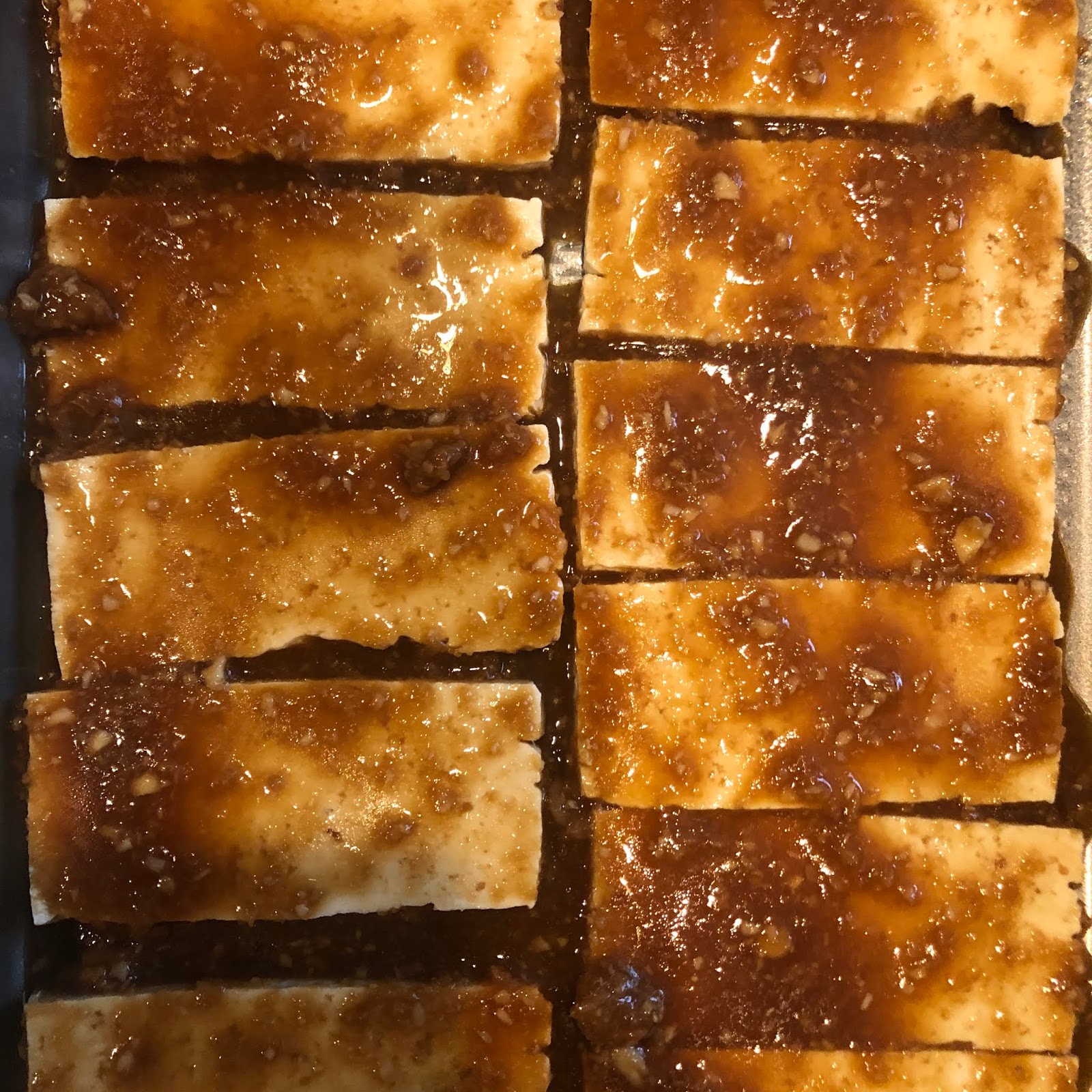 Preheat oven to 400 degrees Fahrenheit. Slice the tofu into 1/4″ thick pieces. Place tofu slices on an oiled baking pan.